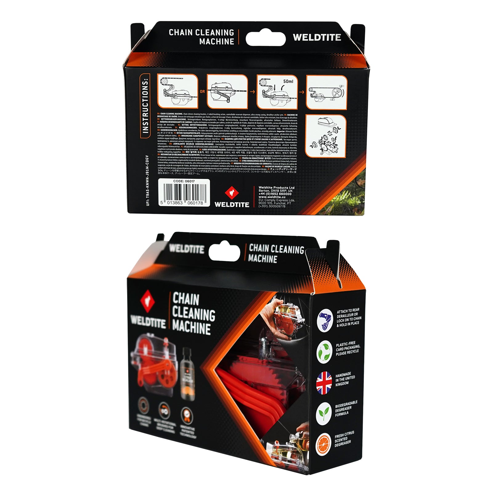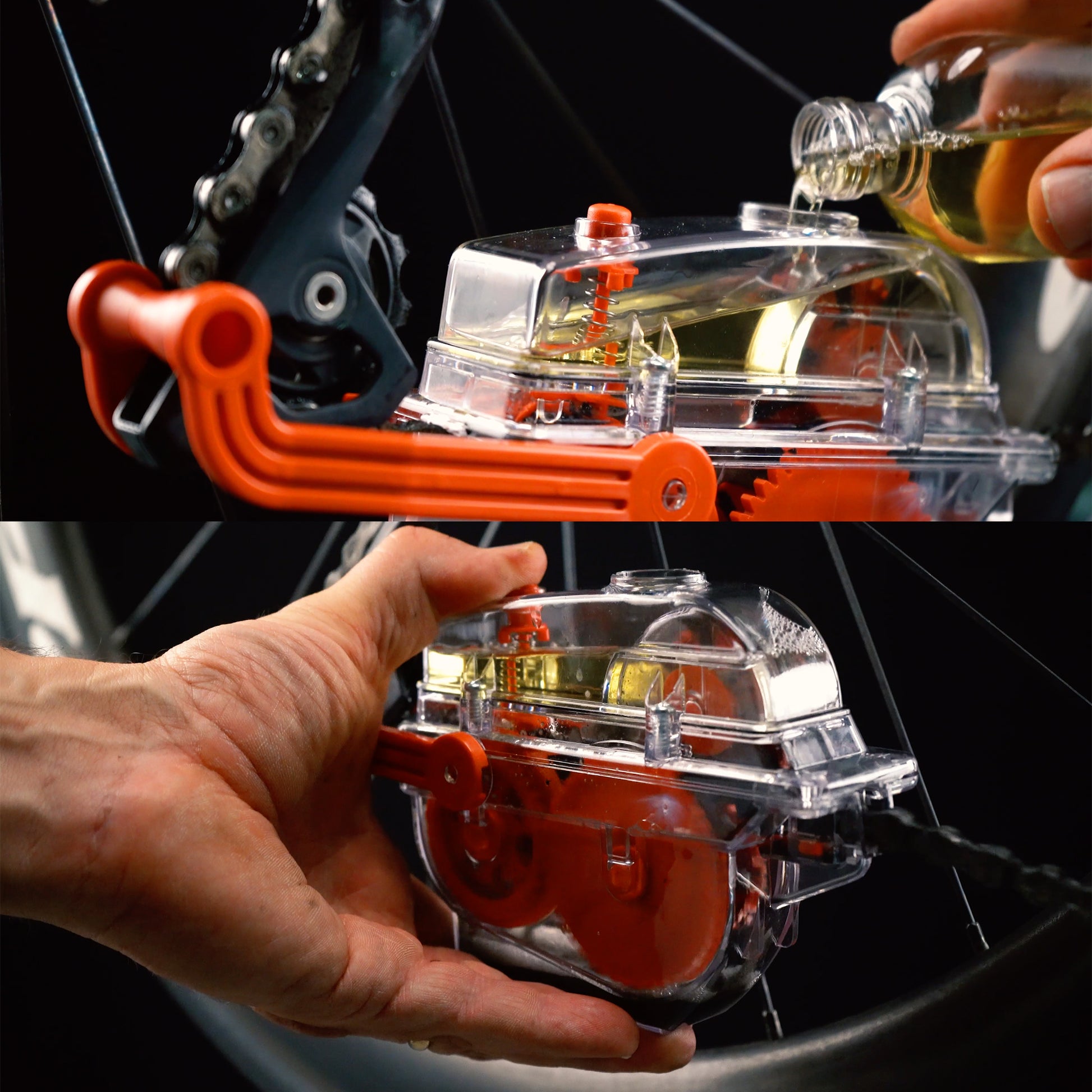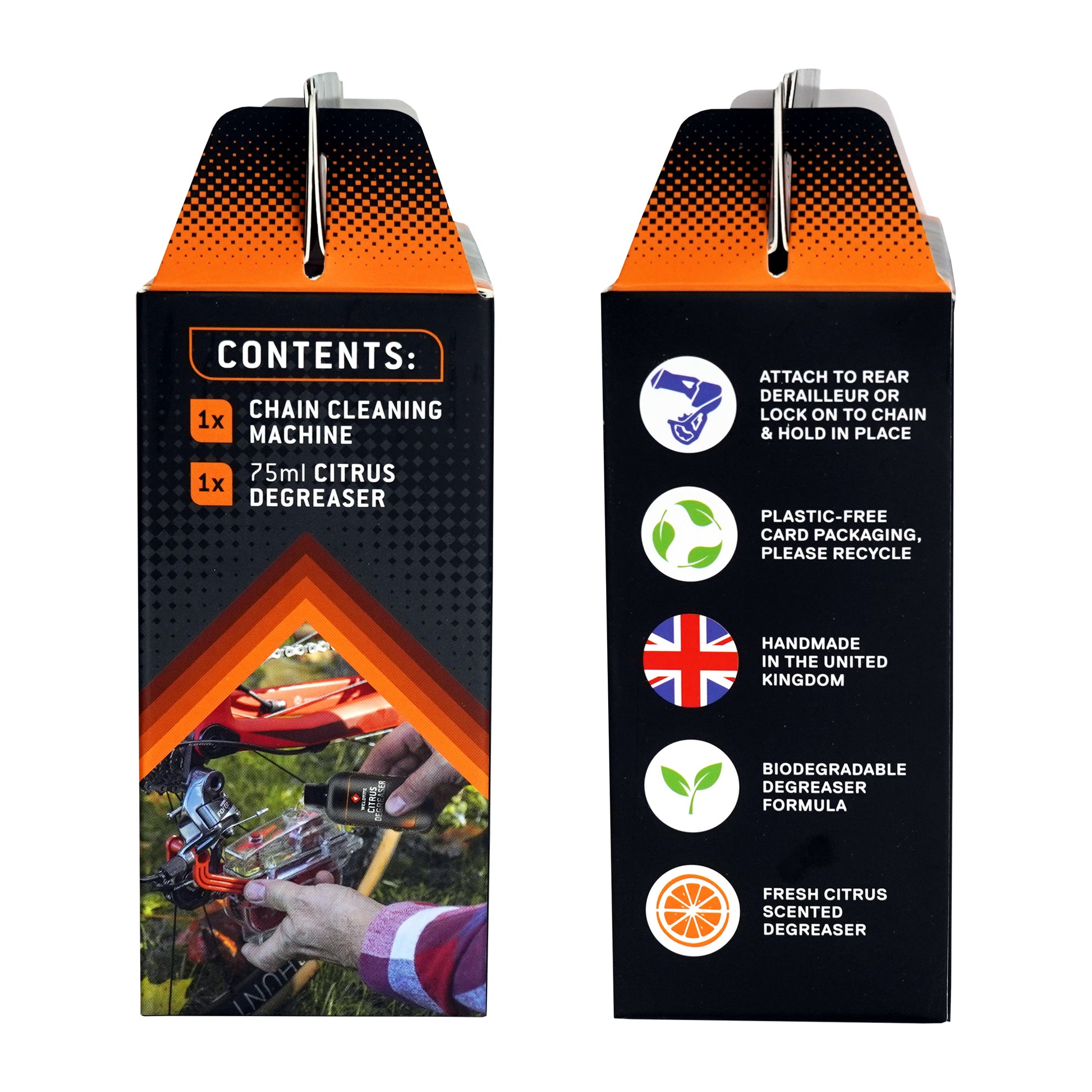 Hand-made in the UK, the placement and directions of travel provided by the cleaning brushes create the varying rotational forces required to easily remove dirt and grime. Hands free, deep chain cleaning!