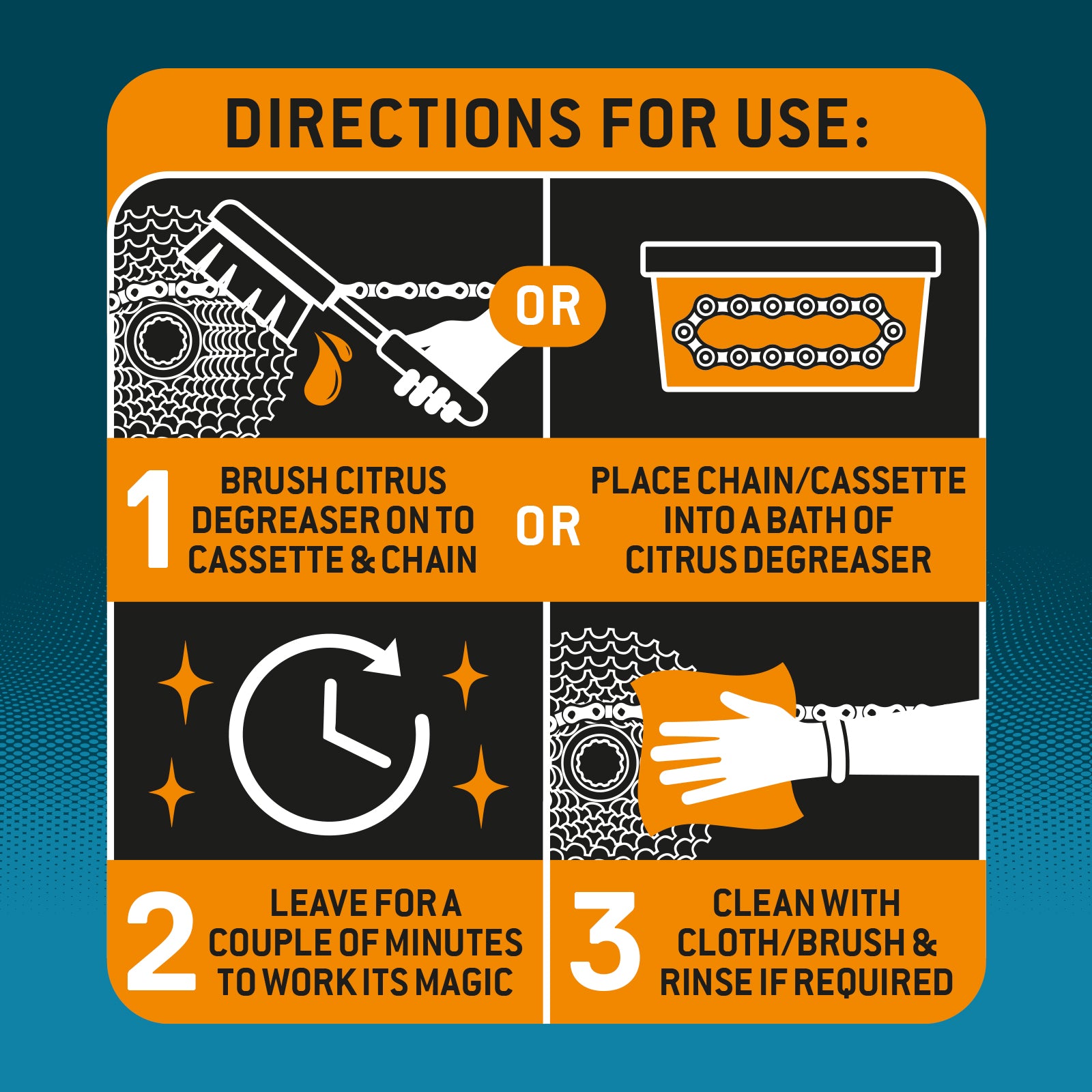 Remove dirt and grime with our powerful yet biodegradable Citrus Degreaser. Use with a cloth, brush or as a ‘bath’ to efficiently clean the drivetrain, removing all traces of grease and oil ready for reapplication of the Weldtite Lube of your choice.