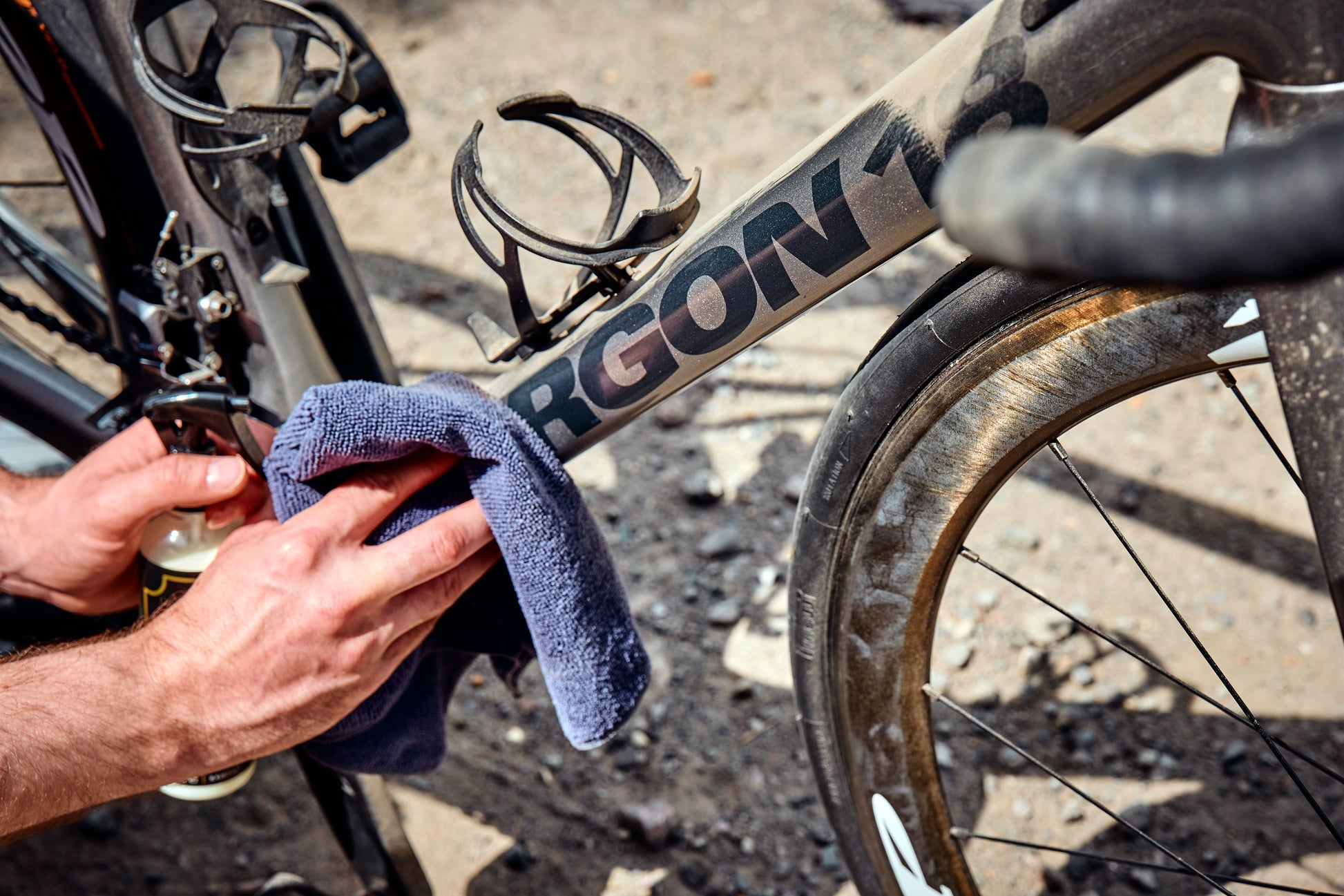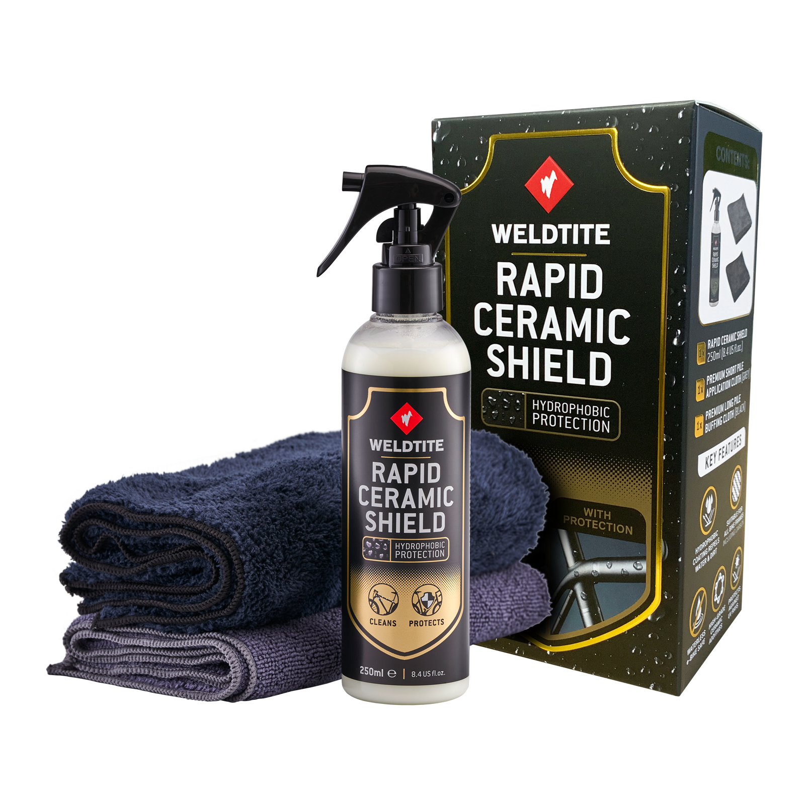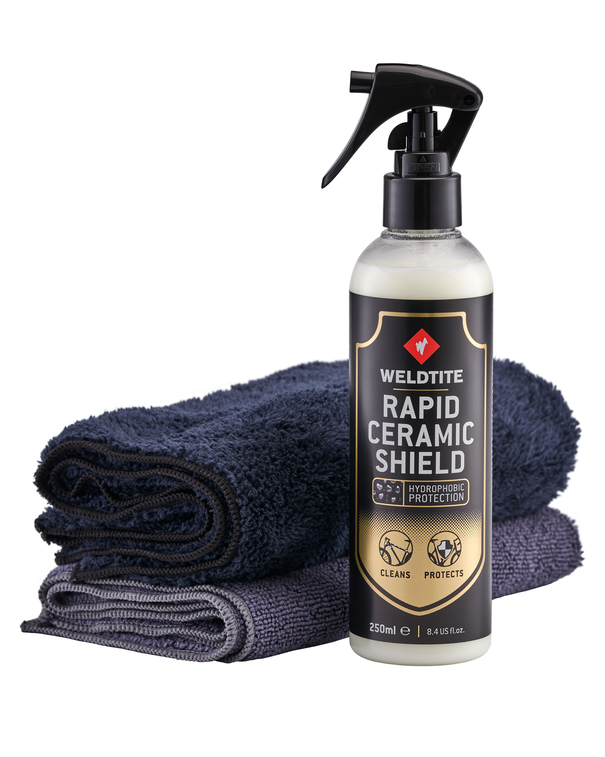 USE: Spray Rapid Ceramic Shield on to the grey short pile cloth (wet cloth first for best results). Wipe down the bike frame avoiding contact with discs and other braking services. Buff frame using premium long pile cloth. Repeat process between rides for best results.