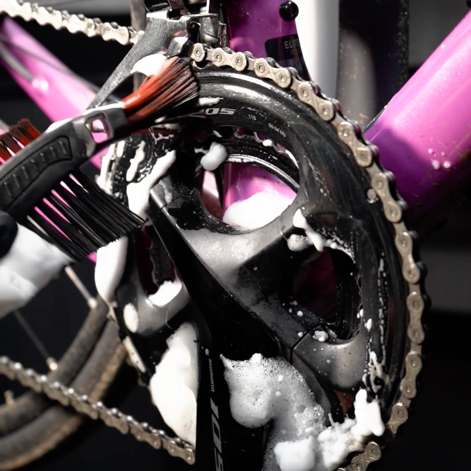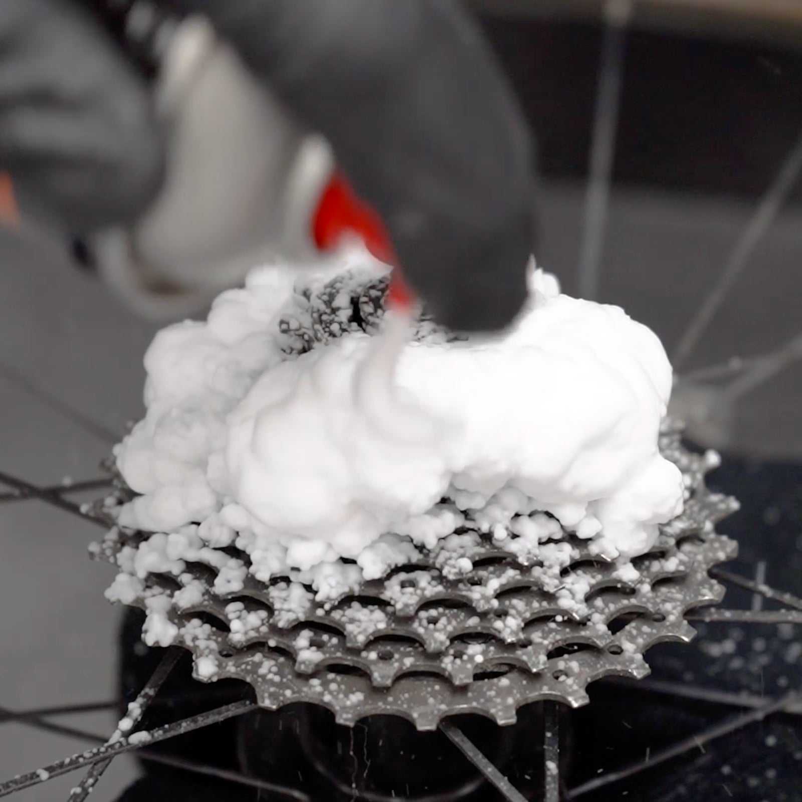 Thunder Foam Chain Degreaser is quick, easy and fun to use. Simply apply directly to the chain, cassette and jockey wheels. Leave for a minute to perform its magic and then work in further with a cloth or brush. If time pressured a quick rinse with water will then remove any traces of foam.
