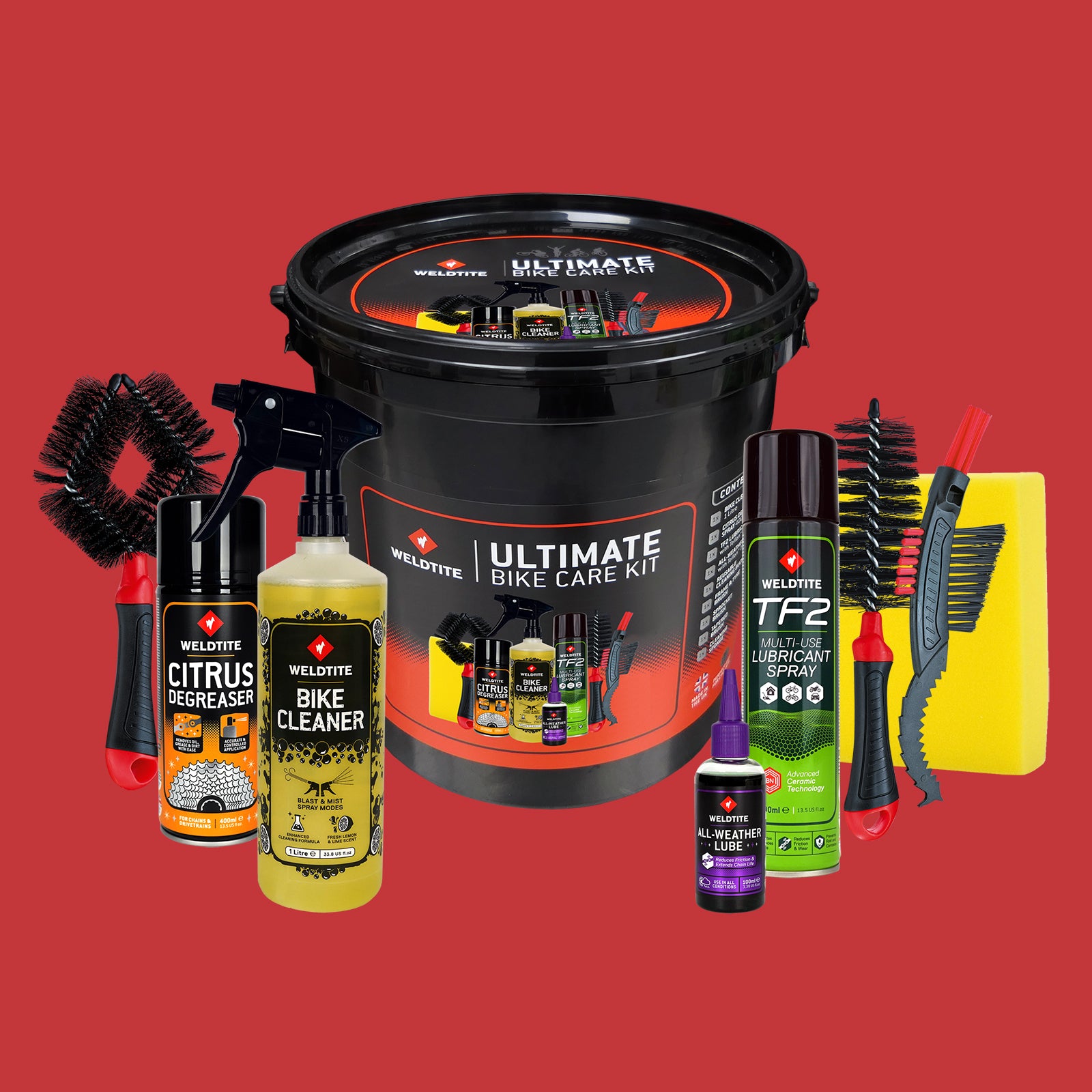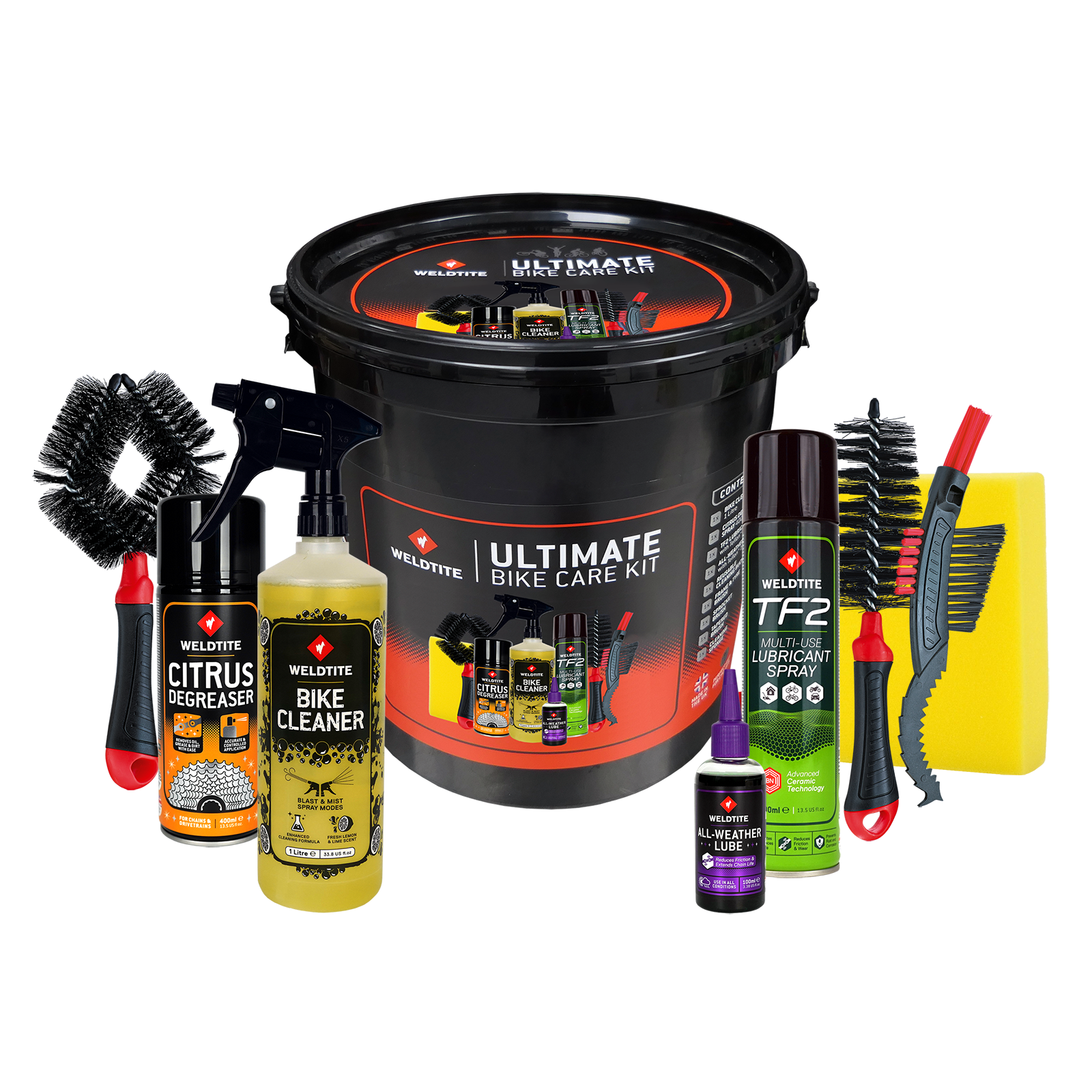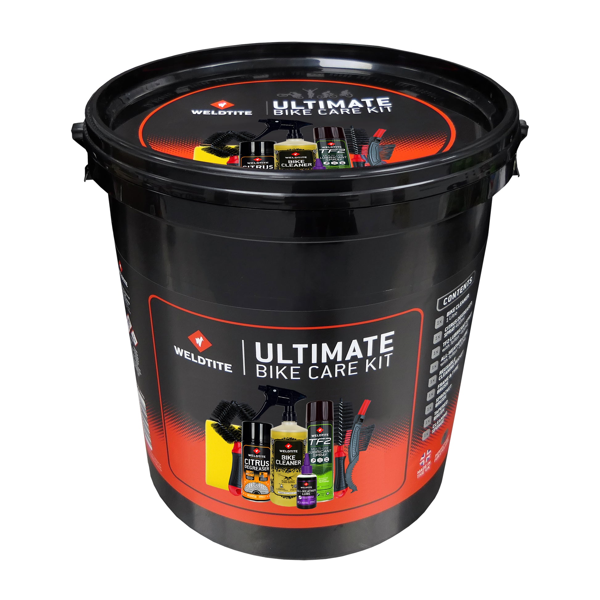 The Ultimate 9-in-1 maintenance kit for cleaning your bike including a 12L bucket.