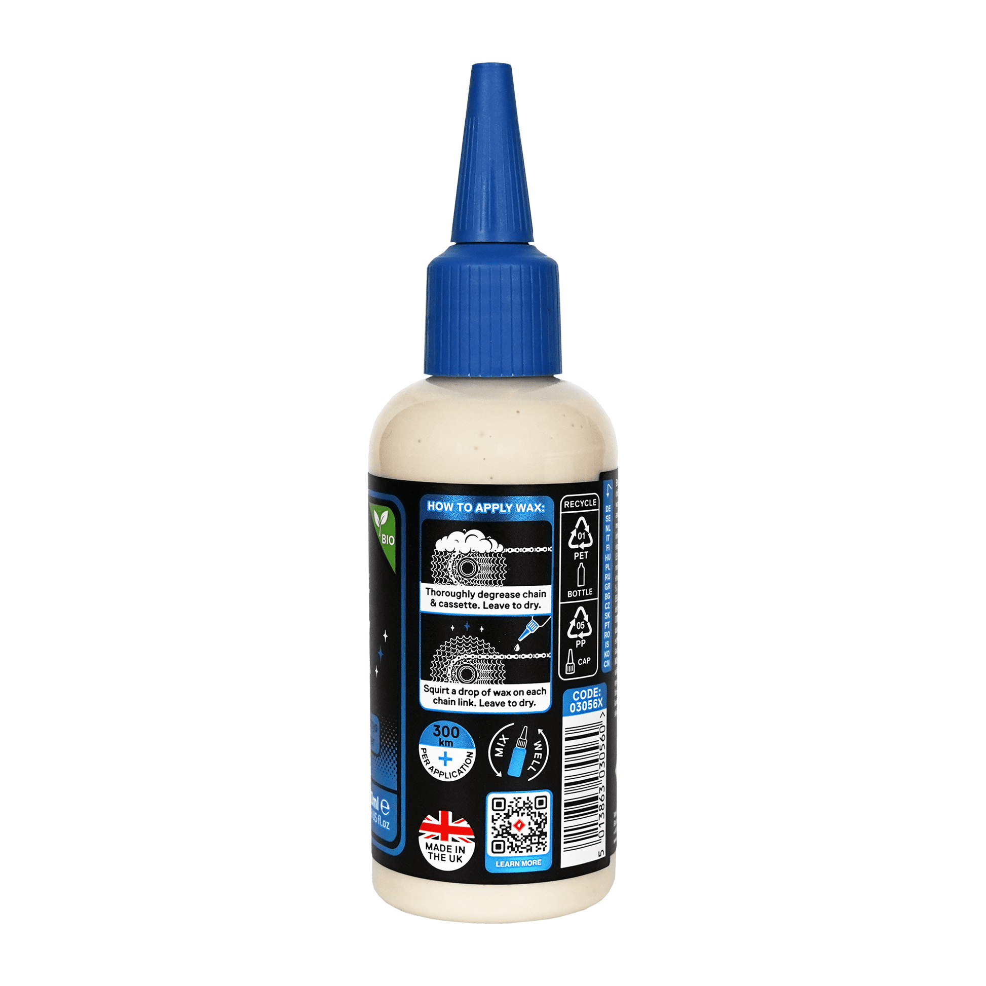 How to Use: Thoroughly degrease chain and cassette. Leave to dry. Shake well, squirt a drop of wax on each chain link. Leave to dry. For rides >300km, once dry, apply a second drop on each chain link and leave to dry.
